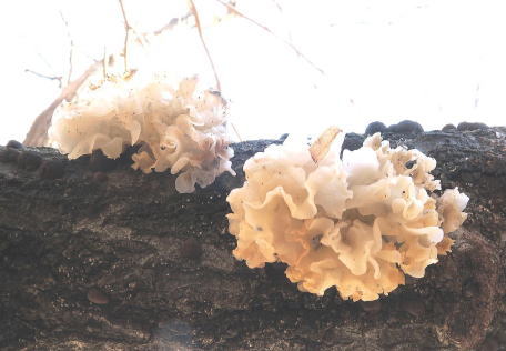 子実体は花びら形の集合、半透明の白で、肉はゼラチン質だが乾くと軟骨質になるが水でもどすことができる。