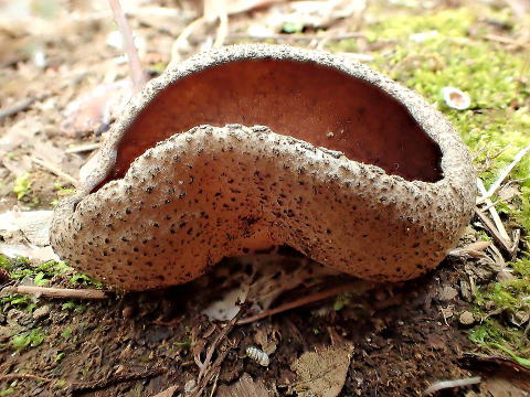 子実体はチャワンタケから皿形に開き、上面は褐色で皺があり、外面は類白色で粒状の黒い鱗片がおおう。
